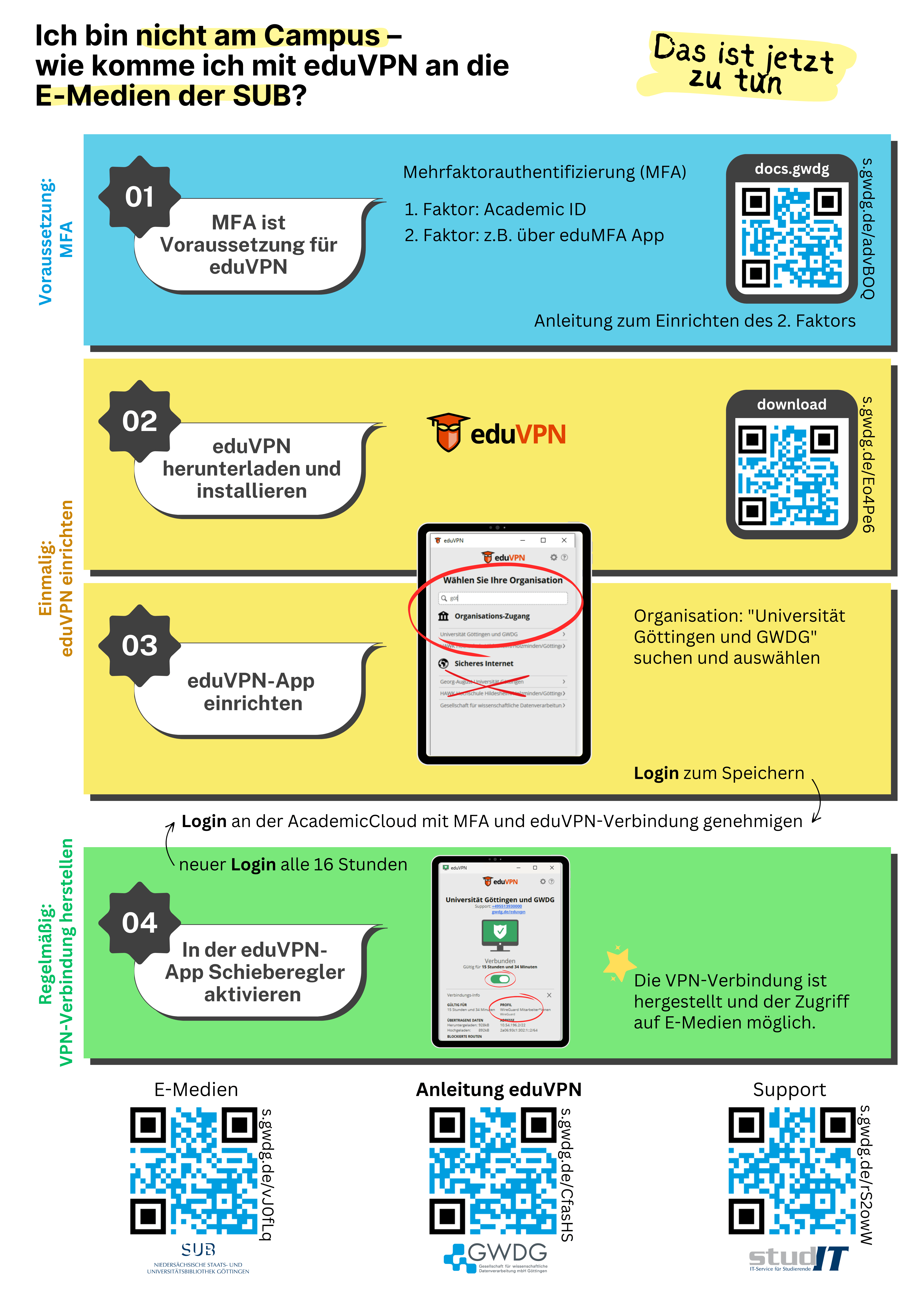 This requires the use of the eduVPN app. This app is also available for all mobile devices. Detailed information on use and installation can be found on the GWDG website and in this brief overview.